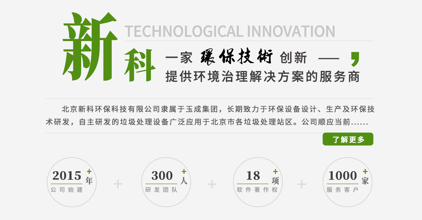 北京新科環(huán)保科技有限公司隸屬于玉成集團(tuán),是一家專(zhuān)業(yè)提供垃圾綜合治理全產(chǎn)業(yè)鏈服務(wù)的環(huán)保企業(yè)。長(zhǎng)期致力于環(huán)保設(shè)備設(shè)計(jì)、生產(chǎn)及環(huán)保技術(shù)研發(fā),自主研發(fā)的垃圾處理設(shè)備廣泛應(yīng)用于北京市各垃圾處理站區(qū)。