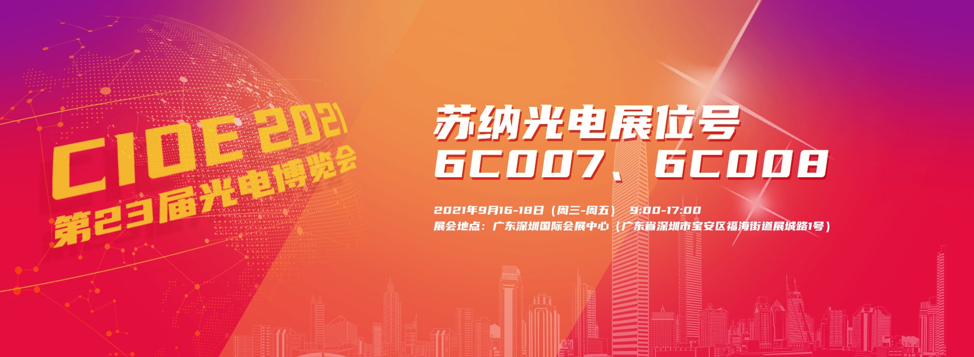 第23屆中國國際光電博覽會(CIOE)將于2021年9月16-18日在深圳隆重舉行,作為晶圓級光學微透鏡的全國產領先企業,蘇州蘇納光電有限公司(簡稱蘇納光電)將攜三大板塊(硅透鏡、硅基微槽/熱沉、熔融石英透鏡)全系列產品亮相信息通信展6號館6C007、6C008展位,誠摯邀請與會各界人士蒞臨參觀、交流及業務洽談。