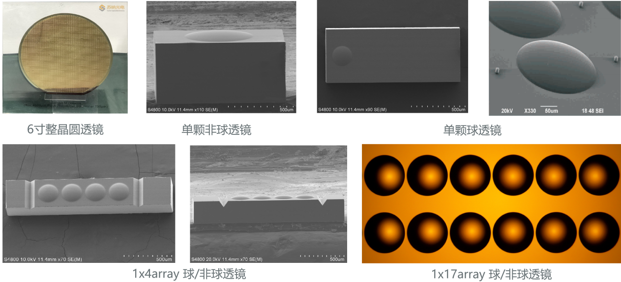 早期,硅透鏡全部由國外公司壟斷。蘇納光電經過多年技術研發投入和市場的積極開拓,現可量產Roc≤6000μm, Diameter≤1000μm, Conic≥ -12的單顆、陣列非球硅透鏡,Roc≤6000μm, Diameter≤1000μm的單顆、陣列(pitch250/500/750μm)球硅透鏡。公司是國內最早成功推出400G光模塊用球硅透鏡陣列(RX)/非球硅透鏡(TX)樣品并實現批量交付的廠家,現階段可量產50余種硅基球透鏡,30余種硅基非球透鏡,開發的硅透鏡產品超百款,在國內處于領先地位。蘇納光電的硅透鏡產品已成功導入90%以上的國內光模塊企業(含生產基地在國內的跨國企業),累計服務各類客戶130余家,實現了1000萬只以上批量出貨。