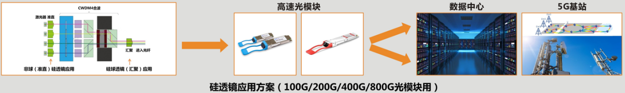 蘇納光電的核心產品微透鏡芯片是高速光模塊里的重要光學元件。近年來,硅透鏡由于其先天的技術優勢(折射率大、小尺寸、球心距精度高等)和成本優勢(模具費用低、產能大、單價低、交期短等),在主流光模塊廠商100G/200G/400G/800G產品中得到了大批量應用。其中,單顆非球硅透鏡主要應用于發射(TX)端,放置于DML/EML等激光器后方,起光束準直或者會聚作用;陣列球硅透鏡主要應用于接收(RX)端,放置于探測器前方,起光束會聚作用。